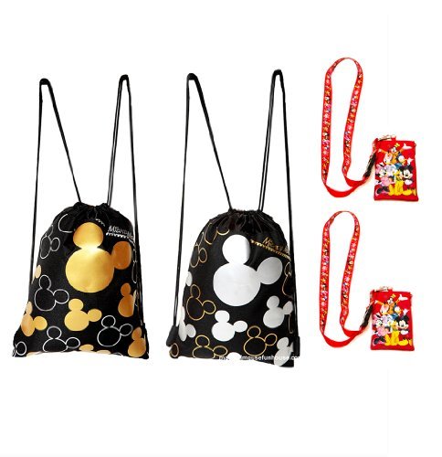 4 PACK DISNEY MICKEY MOUSE DRAWSTRING BACKPACKS AND LANYARDS, 1 GOLD AND 1 SILVER DRAWSTRING & 2 RED MICKEY AND FRIENDS LANYARDS.