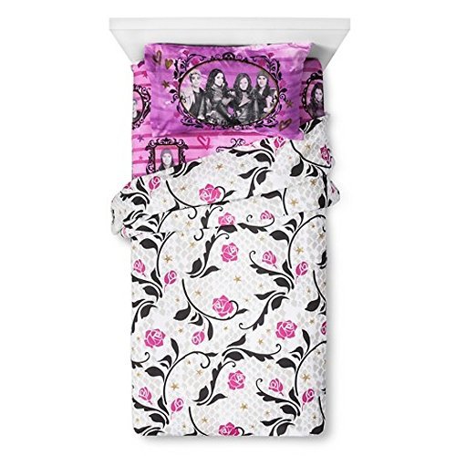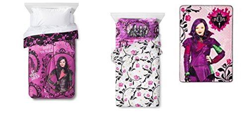 details Featuring Mal, the daughter of Maleficent, this bedding is fit for a future queen. This awesome, reversible comforter features the devious Mal, who wishes to be just like her mother. The Disney Descendants Comforter- Twin will have your daughter dreaming of far away kingdoms in no time. Be sure to check out The Disney Descendants Bedding Collection for coordinating pieces. For easy care, machine wash cold and tumble dry. Number of Pieces: 1 Includes: Comforter Weave Type: Microfiber Dimensions: 86.000L 64.000W Care and Cleaning: Machine wash, cold; Non chlorine bleach when needed; Tumble dry, normal, low heat; Do not iron; Do not dry clean details Featuring Mal, the daughter of Maleficent, this bedding is fit for a future queen. This awesome bed blanket features the devious Mal, who wishes to be just like her mother. The Disney Descendants Blanket- Twin will have your daughter dreaming of far away kingdoms in no time. Be sure to check out The Disney Descendants Bedding Collection for coordinating pieces. For easy care, machine wash cold and tumble dry. Number of Pieces: 1 Includes: Blanket Weave Type: Micro Plush Care and Cleaning: Machine wash, cold, Non chlorine bleach when needed, Tumble dry, normal, low heat, Do not iron, Do not dry clean details Long live evil! Featuring Mal, the daughter of Maleficent, this sheet set is fit for a future queen. This awesome, bedding features the Mal, Carlos, Evie and Jay. The Disney Descendants Sheet Set- Twin will have your daughter dreaming of far away kingdoms in no time. Be sure to check out The Disney Descendants Bedding Collection for coordinating pieces. For easy care, machine wash cold and tumble dry. Thread Count: 132 Number of Pieces: 3 Includes: 1 Pillowcase, 1 Flat Sheet, 1 Fitted Sheet Weave Type: Woven Care and Cleaning: Machine wash, cold, Non chlorine bleach when needed, Tumble dry, normal, low heat, Iron, low, Do not dry clean