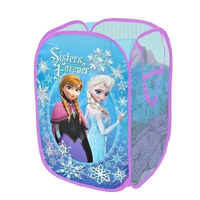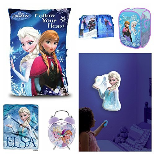 This great collection will bring excitement to your Frozen fan and light up there room with Frozen joy. Great for Children and Toddlers bedding and room d?cor: Story time pillow- 8 soft pages tell the whole story of Disney's Frozen-Fluffy pillow material makes it great for sleepovers, nap time & travel 17'' H x 11'' W x 4'' D- Frozen hamper- 21.5"H x 13.5"W x 13.5"D - Frozen alarm clock -Alarm Light-up on demand Blue hands & Arabic numerals-Requires 1 "AA" battery -Frozen light up Says familiar phrases from the movie- auto shut-off makes it great for night light- sound with remote- Over 13" tall=Requires 3 "AA" & 2 "AAA" batteries (included) -Frozen throw 40" x 50" Silk-Touch Throw: Size: 40" x 50 - 100% polyester