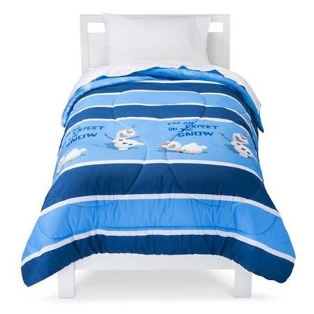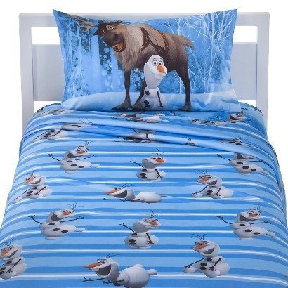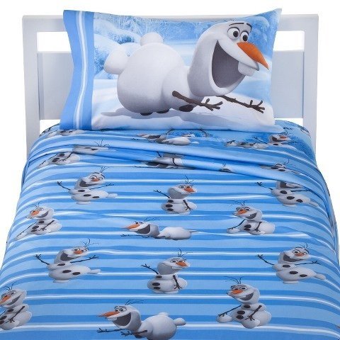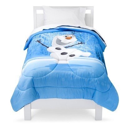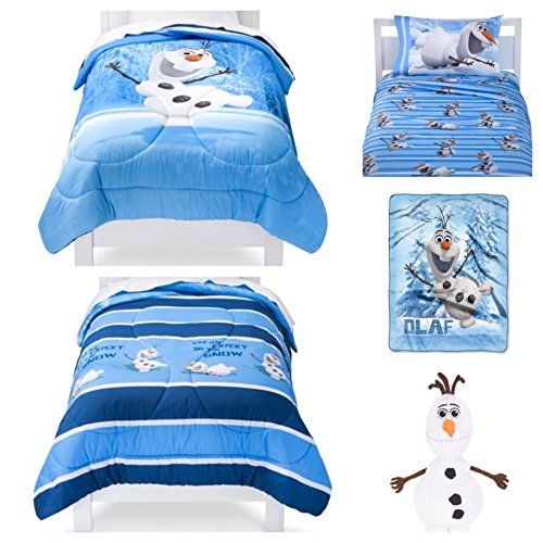 Create a multi combination bedroom makeover with this Disney Frozen Olaf twin bed in a bag bedding set. Set includes reversible comforter, 3 piece sheet set, plush throw blanket and Olaf cuddle pillow. Features character design, soft material, and bright colors. The Olaf comforter displays a large Olaf image on one side and snowman pattern on the reverse. The twin sheets feature the friendly snowman and reversible pillow case with Olaf and Sven. The Frozen Olaf plush blanket features character design, soft material, and works great as a cuddle blanket. The Olaf pillow measures 22" and is designed with fun detail, soft material and compliments this set. Pillow buddy may be used as a sleeping buddy, or travel pillow. Bright colors and detailed character graphics make this full bed set attractive, comfortable and versatile. Features Olaf from the movie Frozen. A Disney Frozen bedding set kids will love. 100% polyester. Machine wash cold, tumble dry low. Pillow buddy: spot clean.