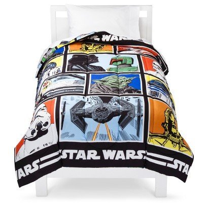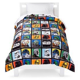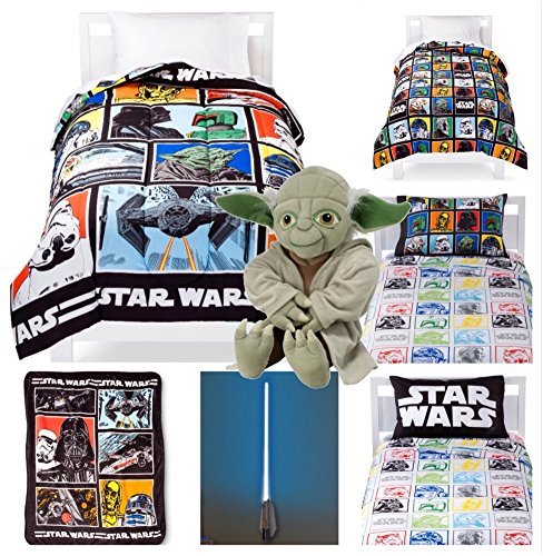The force is strong in this Disney Star Wars Classic Kids Complete Bedding Collection - 7 Piece Set Including Reversible Comforter, Sheet Set and Pillow Case, Oversize Plush Throw Blanket, Yoda Buddy Pillow and Wall Mountable LightSaber Room Light. This awesome comforter features comic illustrations of characters from the iconic movie series, Star Wars. It features a reversible side with a grid of character images including Yoda, C3PO, R2D2, Darth Vader and more. This licensed polyester comforter measures 86"x64". Let your child channel their inner Luke Skywalker or Princess Leia with the Star Wars Classic Sheet Set. This cool licensed bed set features a colorful grid of character illustrations of favorites such as C3PO, R2D2, Darth Vader and more. These cotton-blend sheets include 1 fitted sheet with elastic around the perimeter, 1 flat sheet and 1 reversible pillow case with end closures emblazoned with the Star Wars logo. Star Wars Plush Throw Blanket measures 50" X 60" and is the perfect addition to this bedding collection. Machine wash cold, tumble dry. While they cuddle up to sleep, let them squeeze onto this large 18 inch tall Yoda Cuddle Pillow. Yoda is dressed in his signature hooded robe that can be pulled over his head. Spot clean only. Light up the room with this wall mountable Remote controlled multi colored Lightsaber Room Light! Measures 11"H x 2.5"W x 18"D and has eight color effects options which allows for a custom look. Requires 5 "AAA" batteries (not included).