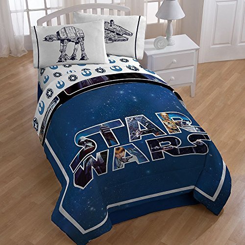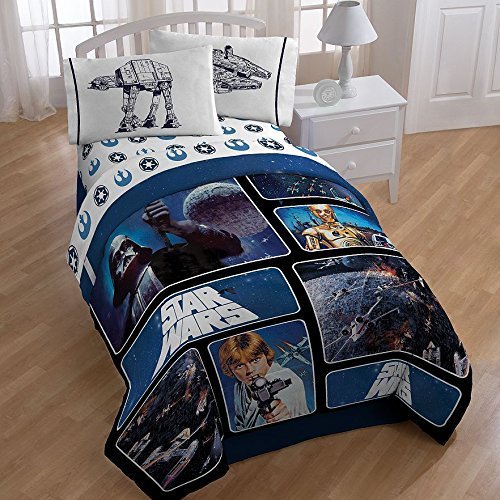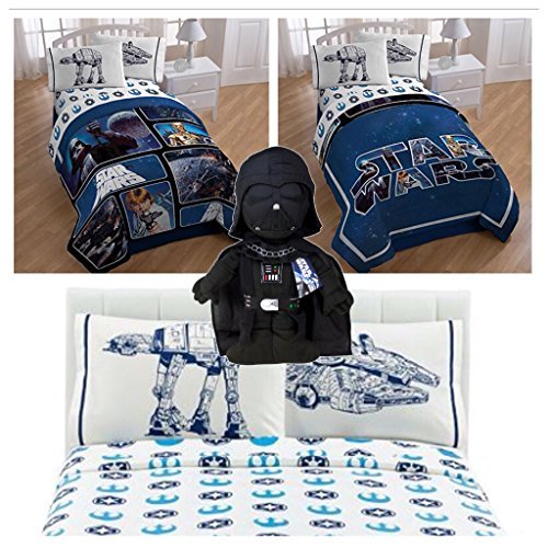 Now your child can cozy up to the characters from the LucasFilm movie, "Star Wars." with this Star Wars Star Wars Complete Twin Bed in a Bag - Reversible Comforter, Sheet Set with Reversible Pillowcase and Darth Vader Pillow Buddy. All the favorites, including Yoda, C-3PO, Darth Vader, R2-D2 and more join forces in this 5 piece bedding collection, including 3 piece Sheet set - twin, Comforter and this Darth Vader Cuddle Pillow in fun style. This cuddle pillow is everything it should be: super soft and perfectly sized for sweet dreams of dominating the Galactic Empire.