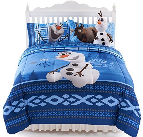 This beautiful Frozen Ice blue Comforter features a large image of Olaf & the pillowcases feature Olaf on one side & Sven on the other side. You can choose which side to display. The Set includes: 1- Full Comforter, 1- Flat Sheet, 1- Fitted Sheet & 2- Pillowcases.