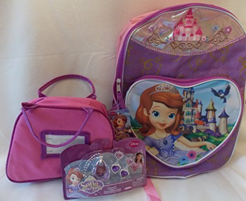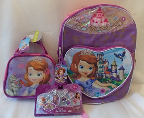 Disney Junior Sofia the First 16' Backpack, Sofia the First Insulated Fashion Lunch Bag Handbag Handbag Purse, And Sofia The First Royal Jewelry Set with Earrings and Amulet or Necklace.