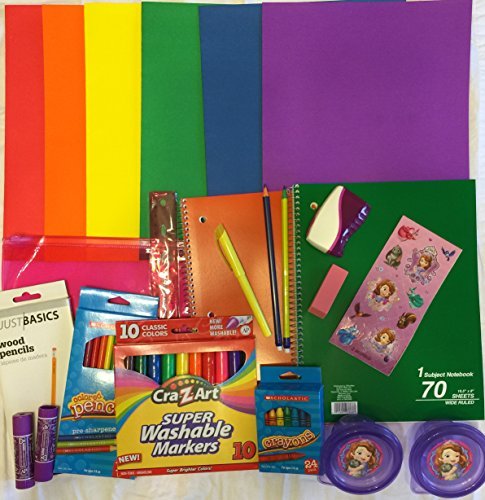 Just about every school supply your elementary school princess will need! Includes: Disney Princess Sofia Backpack and Lunch Box - 24 School Supplies Include 1 - 3 Section Lunch Kit - 2 Snack Bowls - 2 Glue Sticks - 1 Yellow Highlighter - 1 Box 24 Count Crayons - 14 #2 Pencils - 1 - 12 Pack Colored Pencils - 1 - 12" Ruler - 1 Pencil Sharpener - 1 Pink Eraser - 1 Box of 10 Washable Colored Markers - 1 Pencil Bag - 2 Wide Ruled Notebooks - 6 Pocket Folders (Red, Orange, Yellow, Green, Blue & Purple) and 1 Sticker Sheet