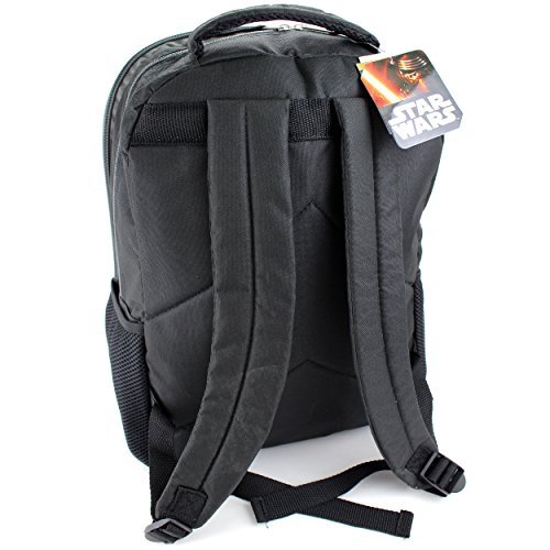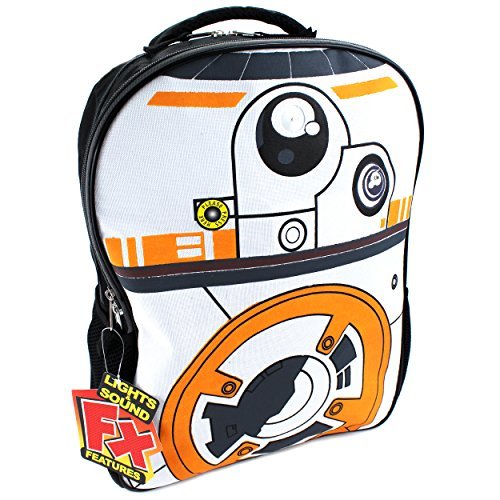 This awesome Star Wars backpack can easily carry books, gym clothes, pencils, and more! Disney day pack features a roomy main compartment and a pocket zip-up for smaller supplies. The sides feature mesh pockets that are great for storing a calculator, note cards, or even a water bottle. This book bag can be hung up when not in use by the webbed locker loop. Back pack features LED lights and sound effects and is designed in durable fabric with fun, colorful graphics of your favorite characters, BB-8 or Kylo Ren and Stormtroopers! The ultimate back to school choice for any fan of Disney Star Wars: The Force Awakens!