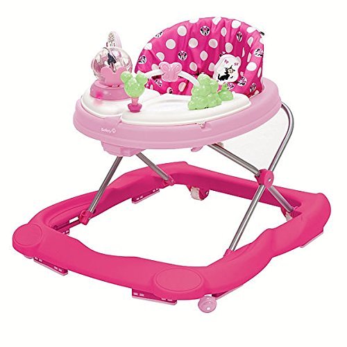 Holds child up to 30 lbs. Note: Child must be able to sit up unassisted;Sturdy wheels for floors and carpets Grip strips to reduce movement on uneven surfaces;Machine-washable padded seat 3-position height adjustment Folds quickly and compactly for storage and travel;2 removable, swing-open activity trays Oversized snack and play area Plays 12 songs;4 Minnie Mouse and Friends toys: Musical, light-up Minnie Mouse, Daisy bead rail, Donald spinner and Mickey playing soccer