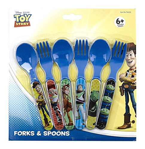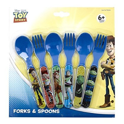 Package Quantity:1 ?|? Style Name:Blue Toy Story Fork and Spoon Set. Six Pack. Easy-to-grasp eating utensils featuring baby's favorite characters. BPA and Phthalate free. Available from Regent Baby Products. Treating your baby royally since 1946.