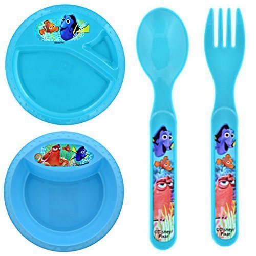 Four piece Finding Dory feeding set includes:;2 piece Finding Dory Flatware Set - Fork and spoon;8.25-in. finding Dory plate;6.75-in. finding Dory bowl.;BPA Free , Top rack dishwasher safe.