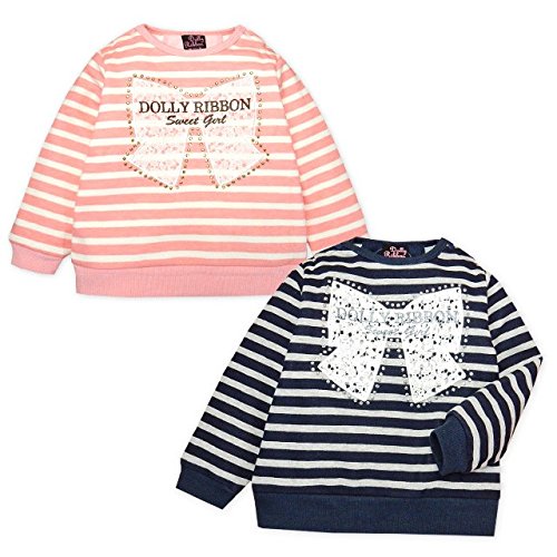 (ピンク/95cm)ベビー服 女の子 トレーナー 長袖 Dolly Ribbon ドーリーリボン 裏シャギー ボーダー リボン スタッズ 刺繍 レースアップリケ 女児 ベビー