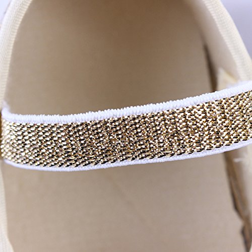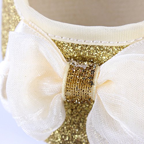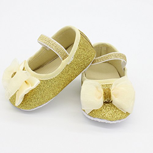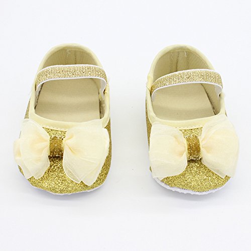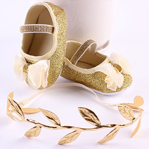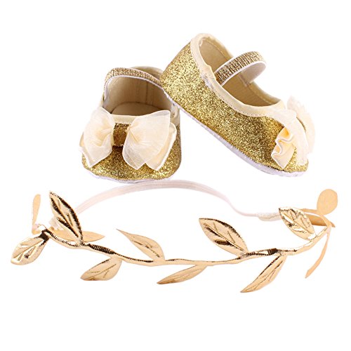 Domybest ベビーシューズ フォーマル ファーストシューズ キッズ靴 シューズ+ヘアバンド2点セット 女の子 リボン プリンセス風 春 夏 秋 通気性よく 軽量 可愛い 柔かい赤ちゃん歩行靴 撮影 出産祝い 結婚式 発表会 七五三 お祝いプレゼント (11cm(3-6ヶ月), 金色)