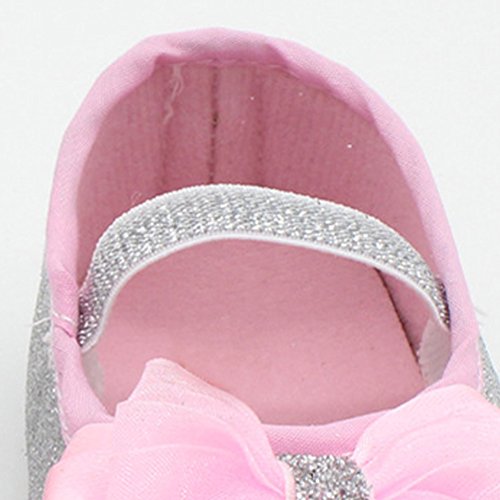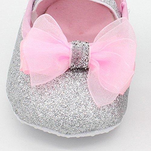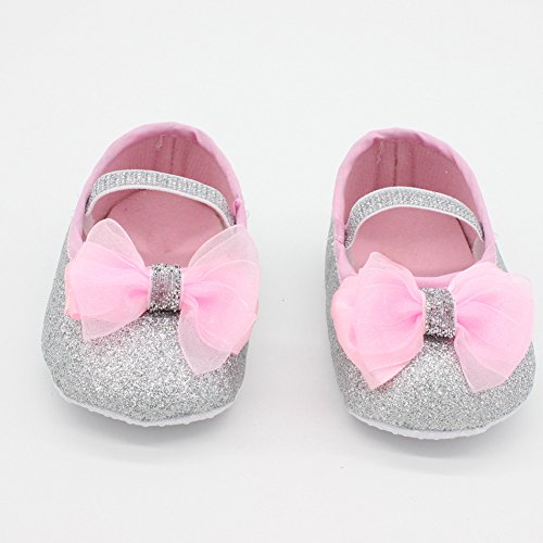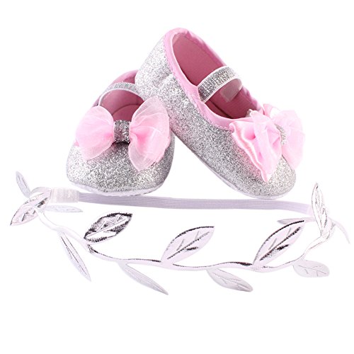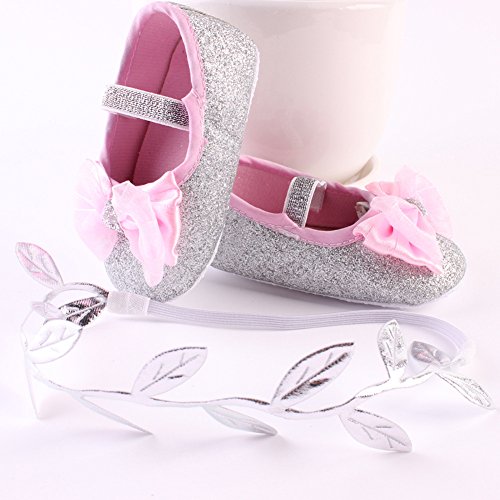 Domybest ベビーシューズ フォーマル ファーストシューズ キッズ靴 シューズ+ヘアバンド2点セット 女の子 リボン プリンセス風 春 夏 秋 通気性よく 軽量 可愛い 柔かい赤ちゃん歩行靴 撮影 出産祝い 結婚式 発表会 七五三 お祝いプレゼント (11cm(3-6ヶ月), 銀色)