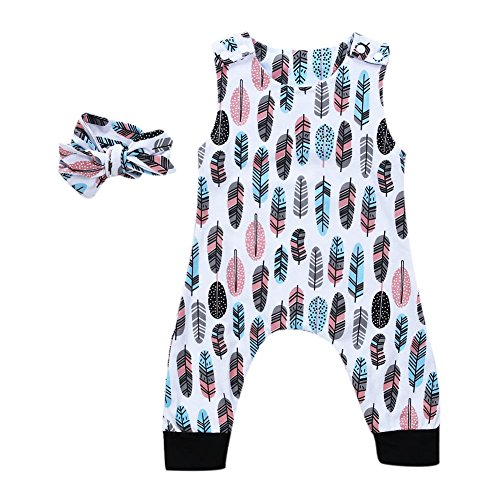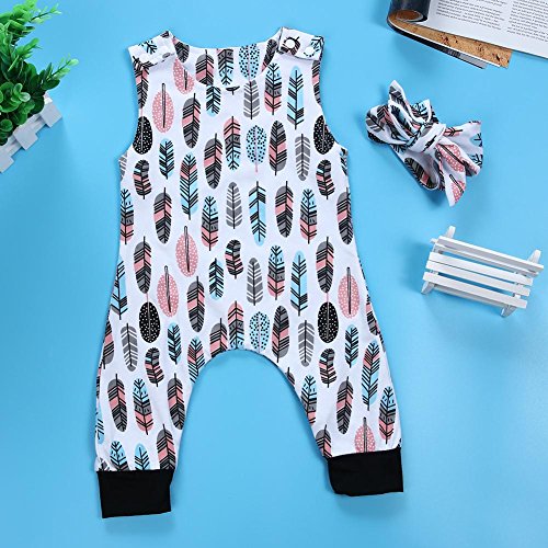 Domybestベビー服 女の子 ロンパース+ヘアバンド 2点セット 夏ボディスーツ 羽プリント オーバーオール 袖無し 新生児 祝い (90)
