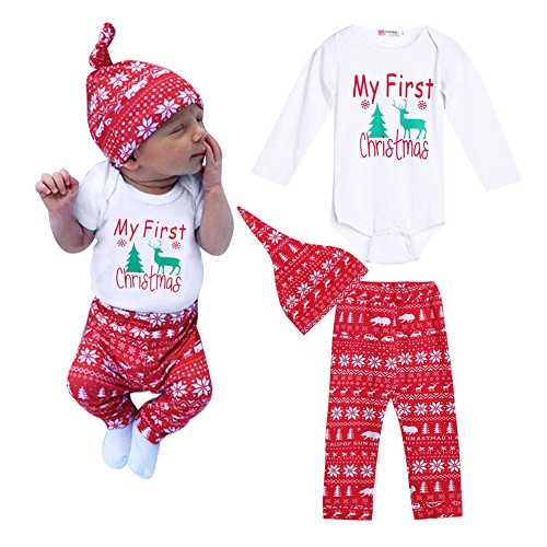 Domybestベビー服 長袖ロンパース+帽子+ロングパンツ 3点セット クリスマス風 ボディスーツ オーバーオール 春秋 普段着 お出かけ (80)