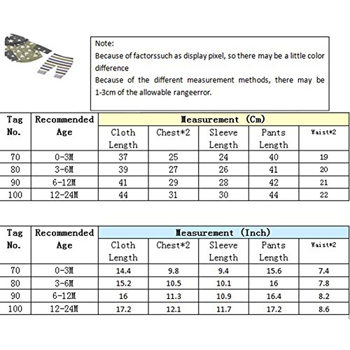 - 【サイズ】 70cm、 0-3ヶ月 、 服の長さ:37cm、袖丈:24cm、パンツの長さ:40cm; 80cm、 3-6ヶ月 、 服の長さ:39cm、袖丈:26m、 パンツの長さ:41cm; 90cm、 6-12ヶ月 、 服の長さ:41cm、袖丈:28cm、パンツの長さ:42cm; 100cm、12-24ヶ月 、服の長さ:44cm、袖丈:30cm、パンツの長さ:44cm;