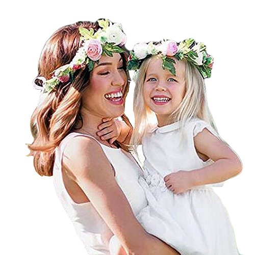 Domybest子供 花冠 フラワーヘアバンド 大人 子供 2点セット ヘッドドレス ヘアアクセサリー 結婚式 子供用 髪飾り 女の子 キッズ 髪飾り 花かんむり ウェディング フラワー ヘッド ママとベビー 2色選べる (レッド)