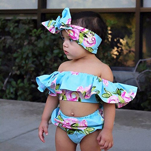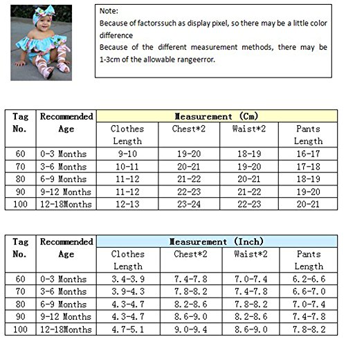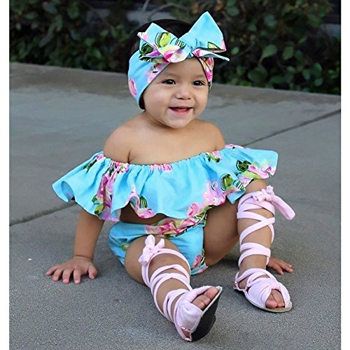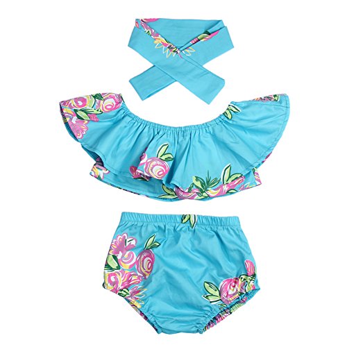 Domybest ベビー服 女の子 ロンパース 上下セット トップス パンツ ヘアバンド 3点セット 赤ちゃん 新生児 夏 オフショルダー 花柄 フリル お出かけ 出産祝い (60(0-3ヶ月))