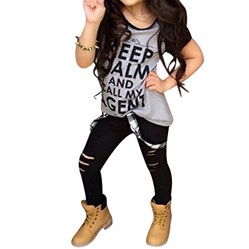 Domybest子供服 女の子 セットアップ キッズ服 キッズTシャツ 半袖Tシャツ+パンツ 穴あきパンツ上下 2点セット 英字プリント 赤ちゃん キッズ ガールズ カジュアル お出かけ 普段着 春 夏 秋 (90(2-3歳))
