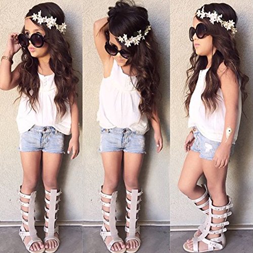 Domybest子供服 女の子 セットアップ キッズ服 キッズTシャツ トップス+デニムショートパンツ 上下 2点セット チュニック 赤ちゃん キッズ ガールズ カジュアル お出かけ 普段着 春 夏 秋 (120(4-5歳))