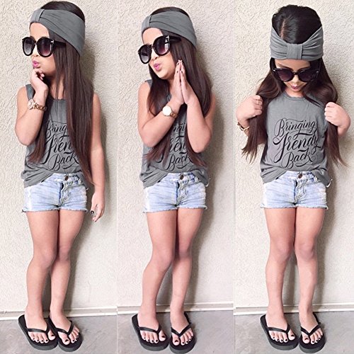 Domybest子供服 女の子 セットアップ キッズ服 キッズTシャツ Tシャツ タンクトップ+デニムショートパンツ+ヘアバンド 3点セット プリント 赤ちゃん キッズ ガールズ カジュアル お出かけ 普段着 春 夏 秋 (90(2-3歳))