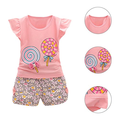 Domybest トップス ショットパンツ Tシャツ ベビー服 上下セット タンクトップ 子供 女の子 半袖 夏スーツ 肌着 超可愛い 柔らかい 伸縮性 快適 普段着 ロリポップ 花柄 リボン付け 人気 2点入り 4色選び 3-4歳