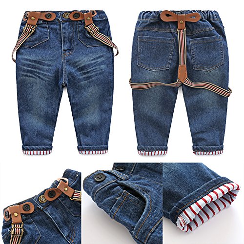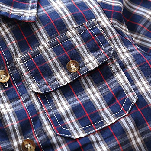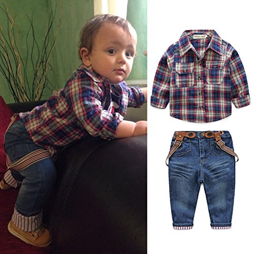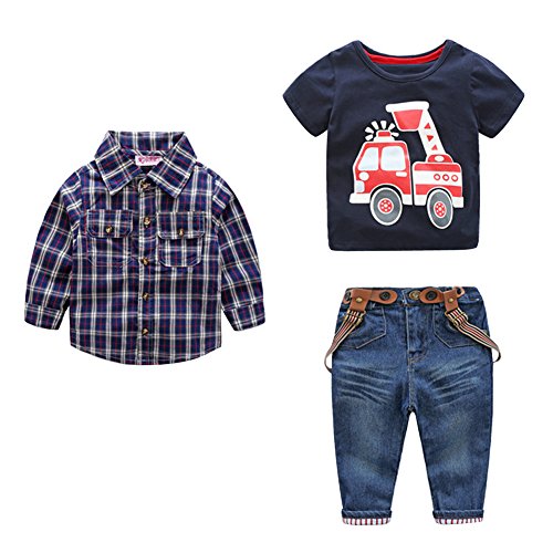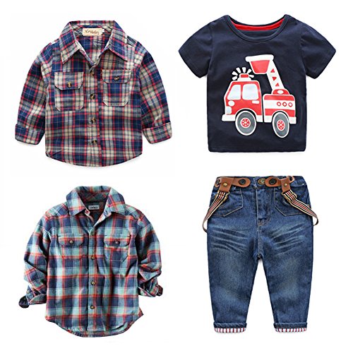 Domybest子供服 男の子 上下セット tシャツ チェック柄のシャツ サスペンダーデニムパンツ 3点セット キッズ アウター ボーイズ 赤ちゃん セットアップ カジュアル おしゃれ 長袖 春 秋 通園 通学 日常生活 チェックシャツはランダムに発送 (90(身長85-95cm))