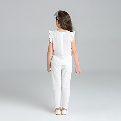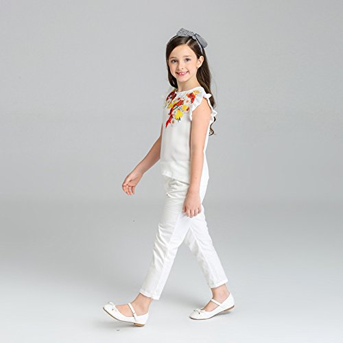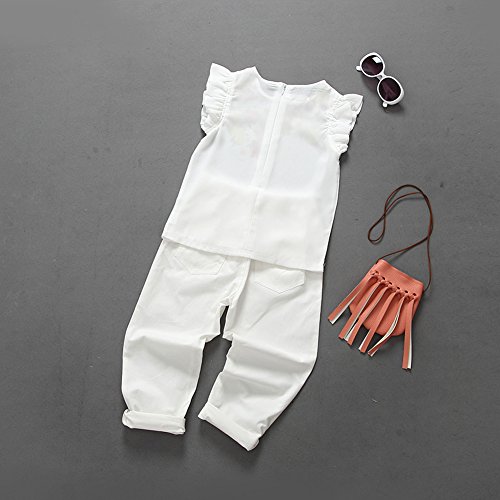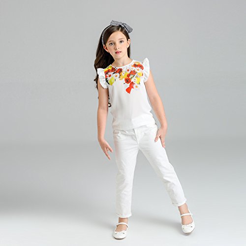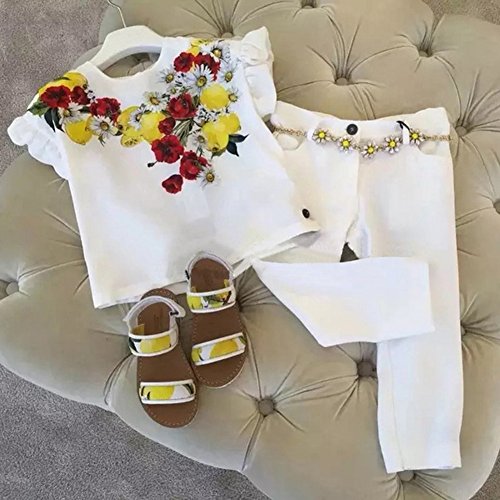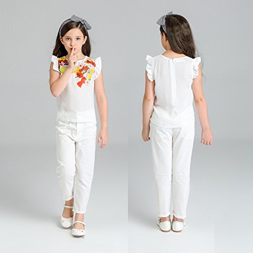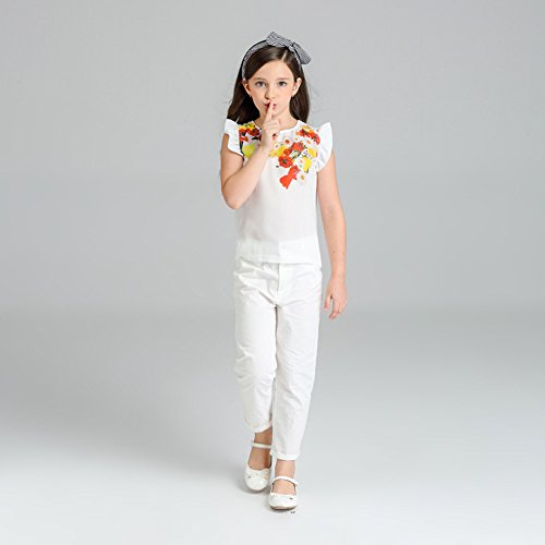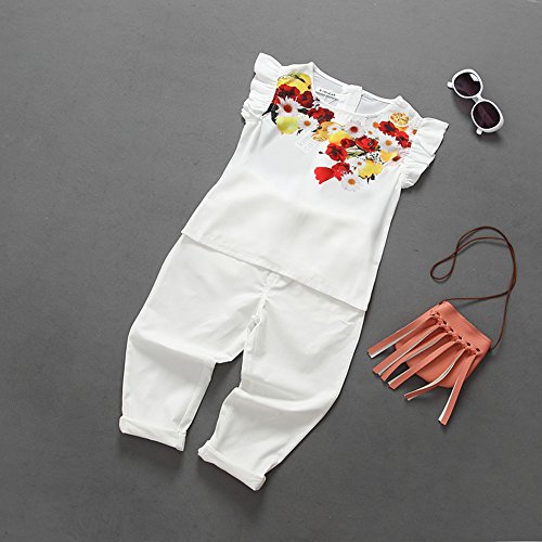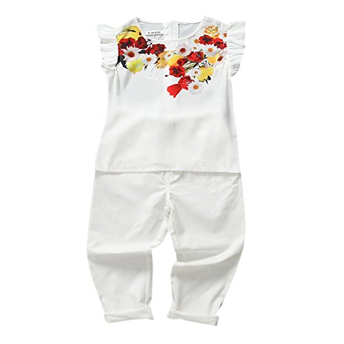 Domybest 子供服 女の子 ベビー服 トップスとロングパンツ 二点セットアップ 2-7歳 半袖 ボーダー花柄ブラウス 春夏秋 白 (120)
