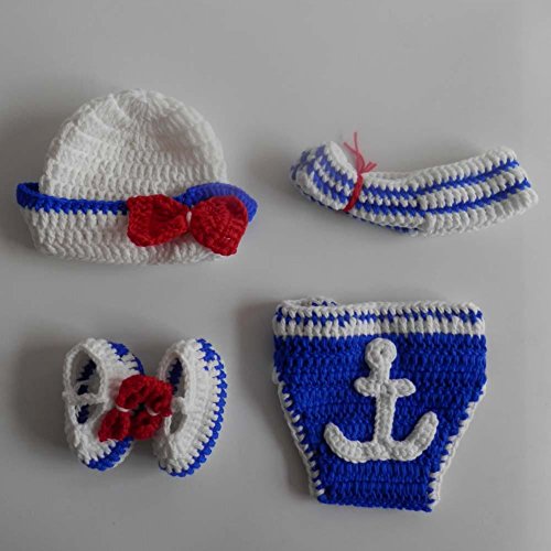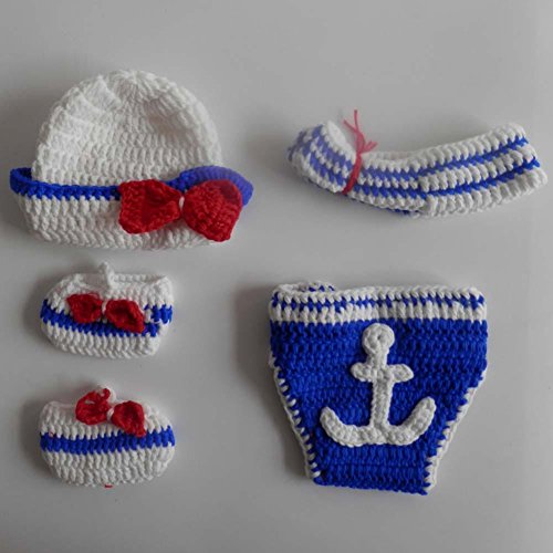 Domybest ベビー ニット 新生児 写真撮影 小道具 柔らかい コットン 男の子 ネイビースーツ 可愛い 帽子+ショーツ+靴+スカーフ (2サイズ可選択)