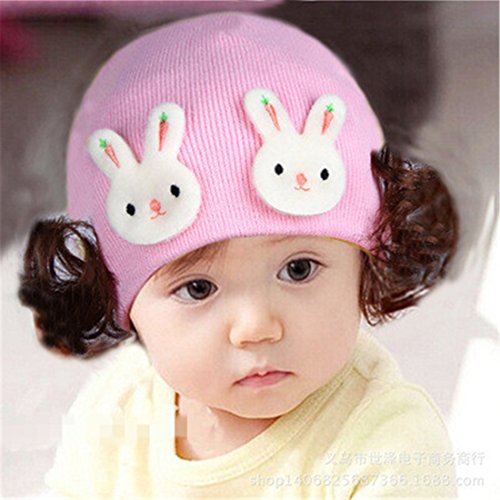 帽子 ベビー キャップ キッズ 子供ハット かつら ウィッグ 付き 新生児 女の子 ヘアバンド ヘアアクセサリー ダブルウサギ ピンク