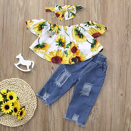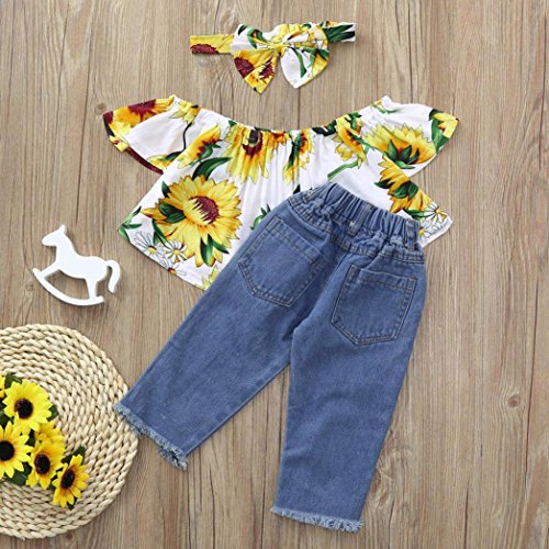 Dourabbi 子供服 赤ちゃん 新生児 幼児 夏 かわいい 3Pcs オフショルダー クロップ トップス デニム ショーツジーンズ ヘッドバンド 洋服 (120, イェロー)