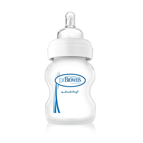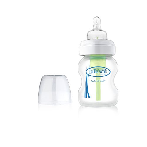 Dr Brown's 150ml Options Wide Neck Bottle is designed to reduce colic and is also proven to help maintain vitamins C, A and E. The patented internal vent system of Options bottles is the only system that eliminates the vacuum and air bubbles found in most baby bottles. It allows air to enter through the nipple collar without being incorporated into the breast milk or formula. The air is then channelled through the internal vent system to the area above the breast milk or formula. This positive pressure eliminates nipple collapse and can help reduce the build up of fluid in baby's ear. Babies feed more comfortably with the Options system because the vent allows them to nurse without fighting the negative effects of a vacuum or the discomfort of ingesting air bubbles. This helps to reduce colic, spit up, burping and gas.