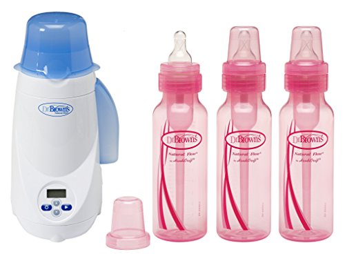 3 Pink Bottles 8 oz. and Dr. Brown's Bottle Warmer;Dr. Brown's bottles are completely BPA, PVC, lead and phthalate free for your baby's safety;Warms standard and wide neck baby bottles and baby food jars;Refillable water chamber warms several bottles before refilling;Cycle memory repeats preferred heating time