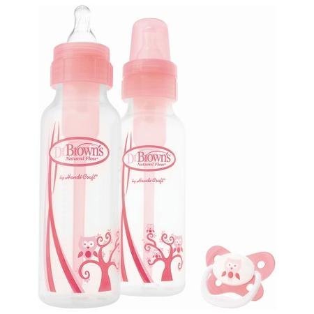 Set includes 2 pink, decorative pink owl eight-ounce standard bottles and 1 decorative level 1 pacifier;Easy to clean and dishwasher safe.;BPA free;Help maintain vitamins C, A and E, plus lipids;Vent system in the Dr. Brown's baby bottles, 3-piece, eliminates the vacuum and air bubbles to help reduce colic, spit-up, burping and gas