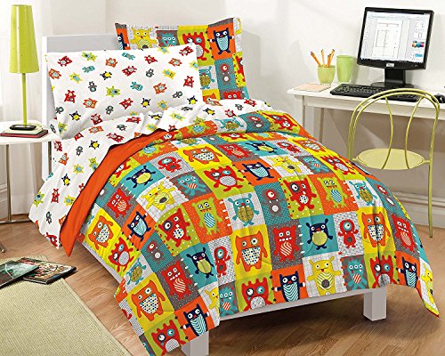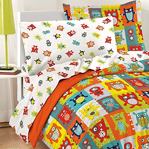 Size:Twin Your little one will be scared silly with this adorable Silly Monsters complete bedroom ensemble! The face of the comforter and standard flanged pillow sham spotlights a snapshot design of cartoon monsters in shades of turquoise, sunshine yellow, sage green, brick red, bright orange, gray and blue reversing to bright orange. The easy-care sheets and pillowcases feature random multicolored small tossed monsters on a pure white ground. All components are constructed of an ultra-soft, 100% polyester 'peached' microfiber fabric and are machine washable.