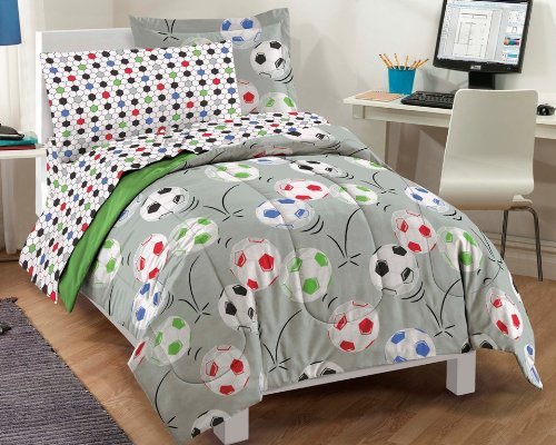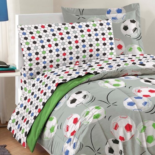 Size:Twin Kick it and make that goal with this Soccer complete bedroom ensemble! The ultra soft comforter and sham feature an allover design of colorful soccer balls in shades of white, green, blue, black and red on a gray ground; the comforter reverses to solid green. A coordinating sheet set showcases a multicolored geometric pattern and is constructed of 100% polyester microfiber fabric.