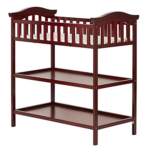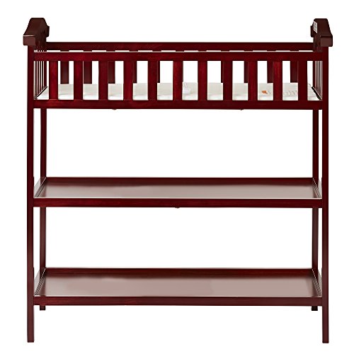 Features include a safety rail, changing pad and restraining strap, Includes a 1 inch changing pad, Features 5 1/2 inch safety rail, 2 shelves for ample storage, Dimensions: 36.5 inch x 21.5 inch x 38.3 inch