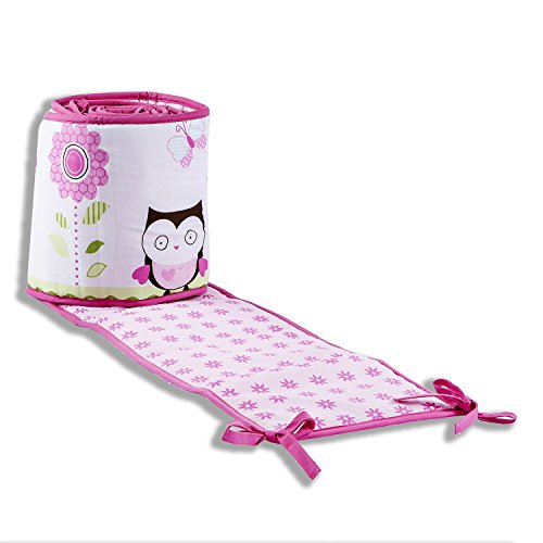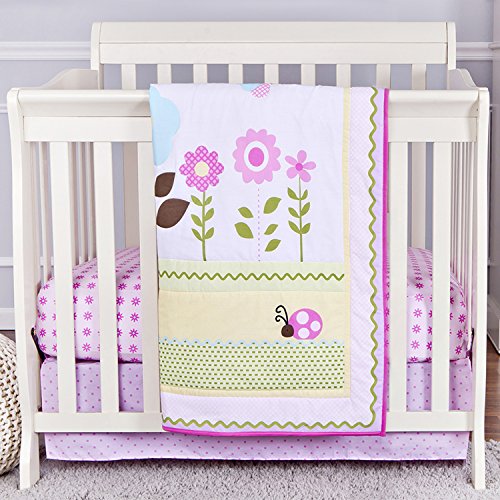 3-piece crib bedding set includes 1 comforter, 1 bumper and 1 fitted sheet;Bedding is composed of 35 percent cotton and 65 percent polyester fabrics;comforter and bumper has 100 percent polyester fiber fill;Sheets fit a standard 38 X 24 crib mattress and comforter measures 38 X 24 inches;Care: machine wash 3-piece crib bedding set separately in cold water, gentle cycle; use only non-chlorine bleach when needed; tumble dry low heat; iron on low heat when needed