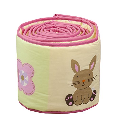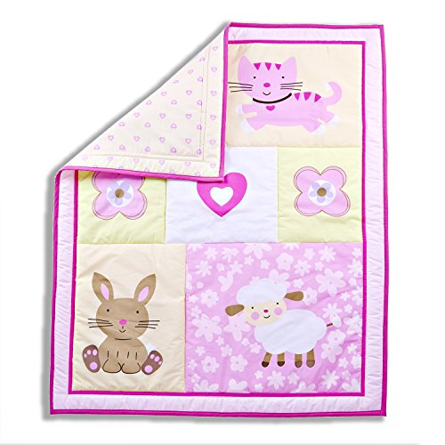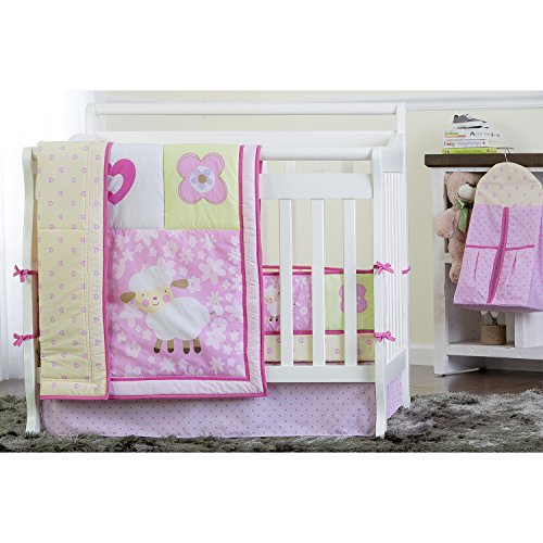 5-piece crib bedding set includes comforter, bumper, fitted sheet,dust ruffle and diaper stacker;Bedding is composed of 35 percent cotton and 65 percent polyester fabrics;comforter and bumper has 100 percent polyester fiber fill;Sheets fit a standard 38 X 24 crib mattress and comforter measures 38 X 24 inches;Care: machine wash 5-piece crib bedding set separately in cold water, gentle cycle; use only non-chlorine bleach when needed; tumble dry low heat; iron on low heat when needed