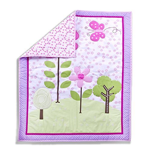 5-piece crib bedding set includes comforter, bumper, fitted sheet,dust ruffle and diaper stacker;Bedding is composed of 35 percent cotton and 65 percent polyester fabrics;comforter and bumper has 100 percent polyester fiber fill;Sheets fit a standard 38 X 24 crib mattress and comforter measures 38 X 24 inches;Care: machine wash 5-piece crib bedding set separately in cold water, gentle cycle; use only non-chlorine bleach when needed; tumble dry low heat; iron on low heat when needed