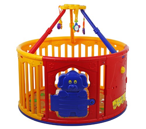 Brightly colored, adjustable jungle gym, Features include a padded mat and cute bear shape door, Made of sturdy, durable plastic, Designed for children 6 months to 24 months, Easy snap together assembly