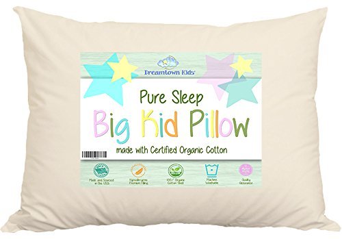 Has your kid grown up and ready for their next pillow? Move them up to something that is the right size: a Pure Sleep "Big Kid" Pillow with a Certified Organic Cotton shell by Dreamtown Kids. We designed this pillow with an upper cervical specialist that is a father himself. Once your kids have outgrown their toddler pillows but aren't ready for a full size pillow you can ease them right into our Dreamtown Kids Big Kid Pillow. We've been reviewed and recommended by chiropractors as the ideal sized pillow for ages 6+ yrs. Your child will love having their very own Organic Big Kid Pillow:for sleep, for naps, sleepovers, for rides to the grandparents or long trips out of town. For some kids, a familiar pillow can provide comfort when sleeping or when away from home.PROUDLY MADE WITH CARE