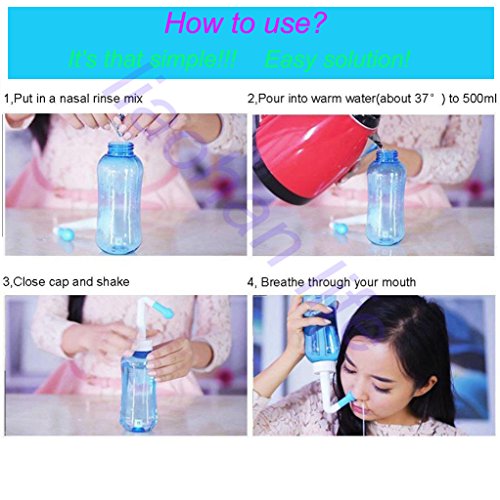 1セット:空気弁のスタイル鼻腔洗浄器(300ml)1個 +ノズル 2個 ユーザーマニュアル(鼻洗浄) 1:あなたの手を洗って、フィルの線まできれいな瓶に詰める(300 ml)は蒸留水またはぬるま湯以前の湯 2:その内容はビンへ注いで、鼻を洗って塩をカット、キャップとチューブ、ボトルに確実に回転する。指に置いて、キ ャップの先端の上のシェイクボトルの混合物を溶かすのに穏やかにします。 3:シンクの前に立って、あなたの快適さレベルを楽しみにして、あなたの頭を傾けます。あなたの口を開いて、息を維 持することなく、ぴったりの場所をキャップに対してあなたの正常な鼻孔とスクイズボトルに穏やかに解決を開始するまでの水 抜きをして反対側の鼻孔から、または、あなたの口から。 4:穏やかにあなたの鼻をかむことは、完全にあなたの鼻をつまんでしたので、これは鼓膜に圧力を適用します。 5:すぐにあなたの左の鼻孔のためのステップ3と4を繰り返してください。 として推薦だけを使用して、警告に従ってください: ワーミング:鼻通路を完全にブロックされるならば、あなたが耳感染症にかかっているかブロックを食べるならば、otリンス をします。