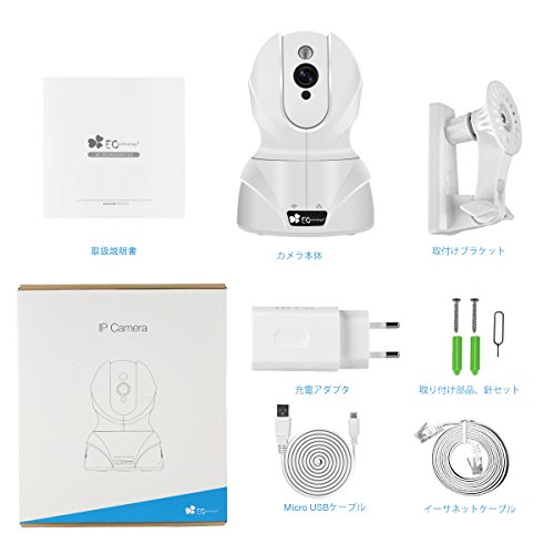 - パッケージ内容: EC Technology IPカメラ、設置用ブラケット、ねじセット、電源アダプタ、充電ケーブル、イーサネットケーブル、12ヶ月保証期間。