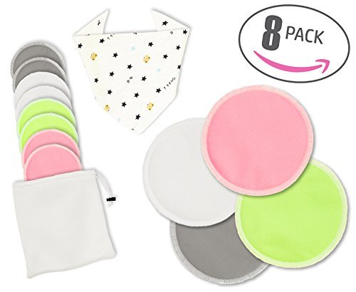 ??COMPLETE NURSING PROTECTION - This set of eight organic bamboo nursing pads prevent the embarrassment of wet spots on clothing from milk leakage; breastfeedingmothers using these pads are confident that the leaked liquid is absorbed efficiently into the nursing pads; each pad is approximately four inches in diameter and a quarter inch wide; the four colored pairs include white and light pink, blue, and gray;;??TOP QUALITY MATERIALS USED - Each includes three layers padding: the outer is waterproof, the inner is microfiber, and soft bamboo is against the breast; the best part about bamboo is it allows efficientcirculation to help nipples breathefresh air while preventing any leaks; bamboo is also known for its high absorption capacity and is ideal for day use or heavy night flow; they do not stick to the nipples like other nursing pads and can be easily removed;;??SOFT, COMFORTABLE, AND EASY TO USE - Unlike other nursing pads, ours are extremely soft and comfortable - so natural that they feel like they mold to your breast's shape; they help soothe sore nipples and prevent any chafing or irritation that might be caused by poor quality disposable pads; the pads are easily inserted into breastfeeding mother's bra and can be machine or hand washed; theyget softer with every wash;;??ECO-FRIENDLY - These nursing pads are made up from sustainably derived organic bamboo which is also hypoallergenic and durable; for nursing a baby, you may have to use up to three thousand disposable pads; however, this set of eight (four pairs) reusable pads reduces landfill and helps the environment;;??RISK-FREE SATISFACTION GUARANTEE plus FREE LAUNDRY BAG AND BANDANA BIB - We offer you a one hundred percent risk-free satisfaction guarantee to let you buy with confidence; no questions asked; we know you will love these pads for their functional effectiveness, warmth, and coziness. So, ORDER NOW and breastfeed with confidence while staying dry.