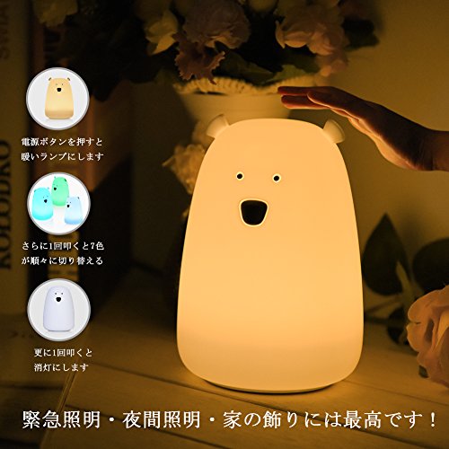 - 【熊を叩くとランプ色調整】電源ボタンを押して、暖色系ライトで点灯して、一回軽く叩くと、7色呼吸光ライトが自由に変更します。二回軽く叩くと、熊ちゃん呼吸ランプは消灯します。暖色→7色取り換え→消灯という順番で切り替わります。(その前本体底面の電源ボタンをオンにする必要)