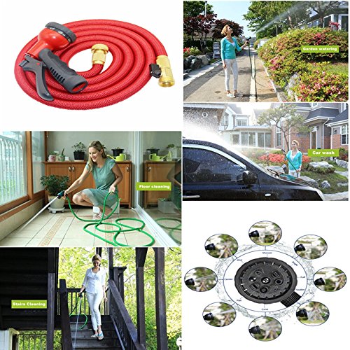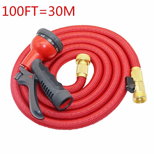 花園用伸縮ホース、elecfanJ 花園 大掃除 洗車用ホース 耐久性 金属製のコネクタ 8パターン散水ノズル 100FT/30M