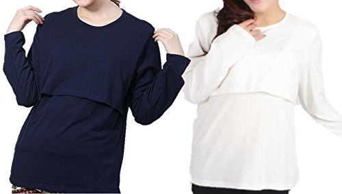 (エカイズ) EKA*is... 授乳服 長袖 2枚組 Tシャツ トップス インナー マタニティ 妊婦服 無地 w034 (L, ネイビー×ホワイト)