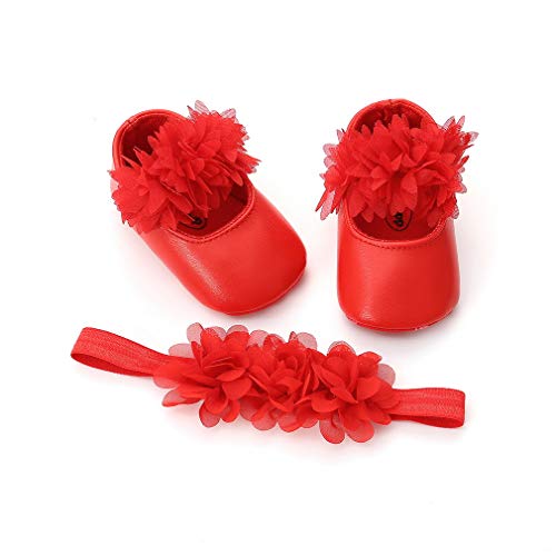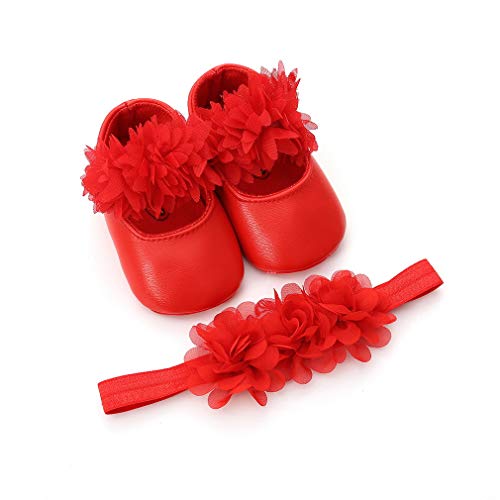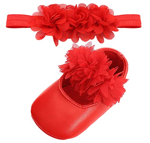 EOZY ベビーシューズ ファーストシューズ フォーマル シューズ ヘアバンド 2点セット 女児 女の子 フラワー 出産祝い 撮影記念 結婚式 可愛い 赤ちゃん用 5 レッド