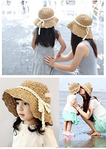 EOZY 親子タイプ つば広帽子 麦わら帽子 ストローハット レディース 女性 ガールズ キッズ 女の子 折りたたみ可 レースリボン ハット 女優帽 子供用 コーヒー色
