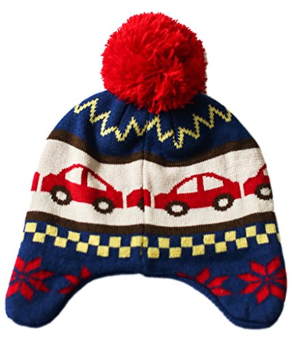 EOZY 可愛い ベビーハット ニット帽子 子供用 新生児 車図案 赤ちゃんキャップ キッズポンポン帽子 耳あて 秋冬防寒 カジュアル 女の子 男の子 ネイビー S